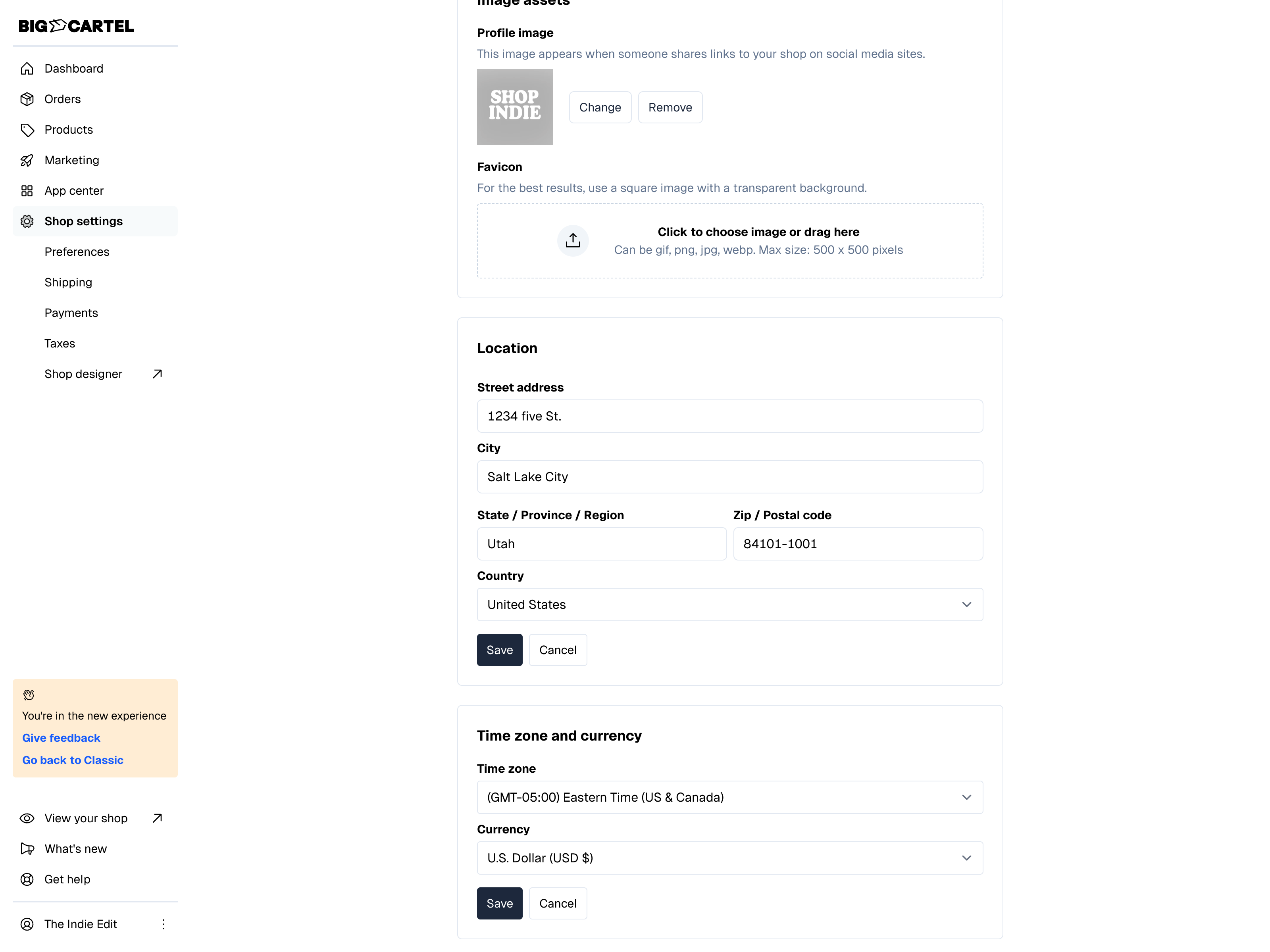 If your shop is also located in the U.S. or Puerto Rico, we require a valid address to make sure we are accurately calculating complicated U.S. tax rules. Lots of Big Cartel shops operate out of garages and second bedrooms — it’s okay to put your home address as your shop location. This info is never visible to customers in your Big Cartel shop.