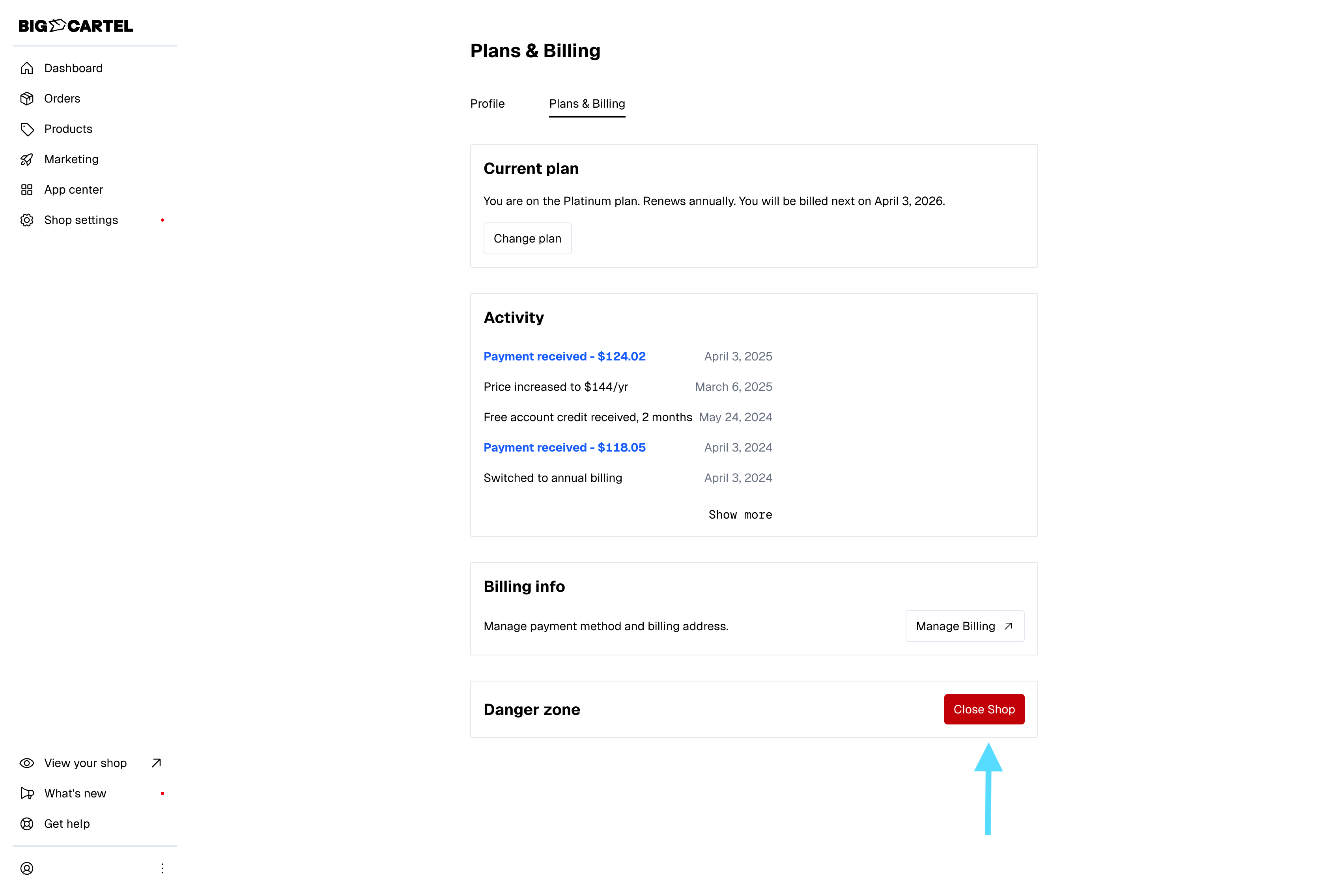 You can follow the steps below to close your shop on your end, or we can take care of that for you. Just email support@bigcartel.com from the email address linked to the account, and we can schedule your shop's closing. We can only close it for you if you reach out from the account email.
