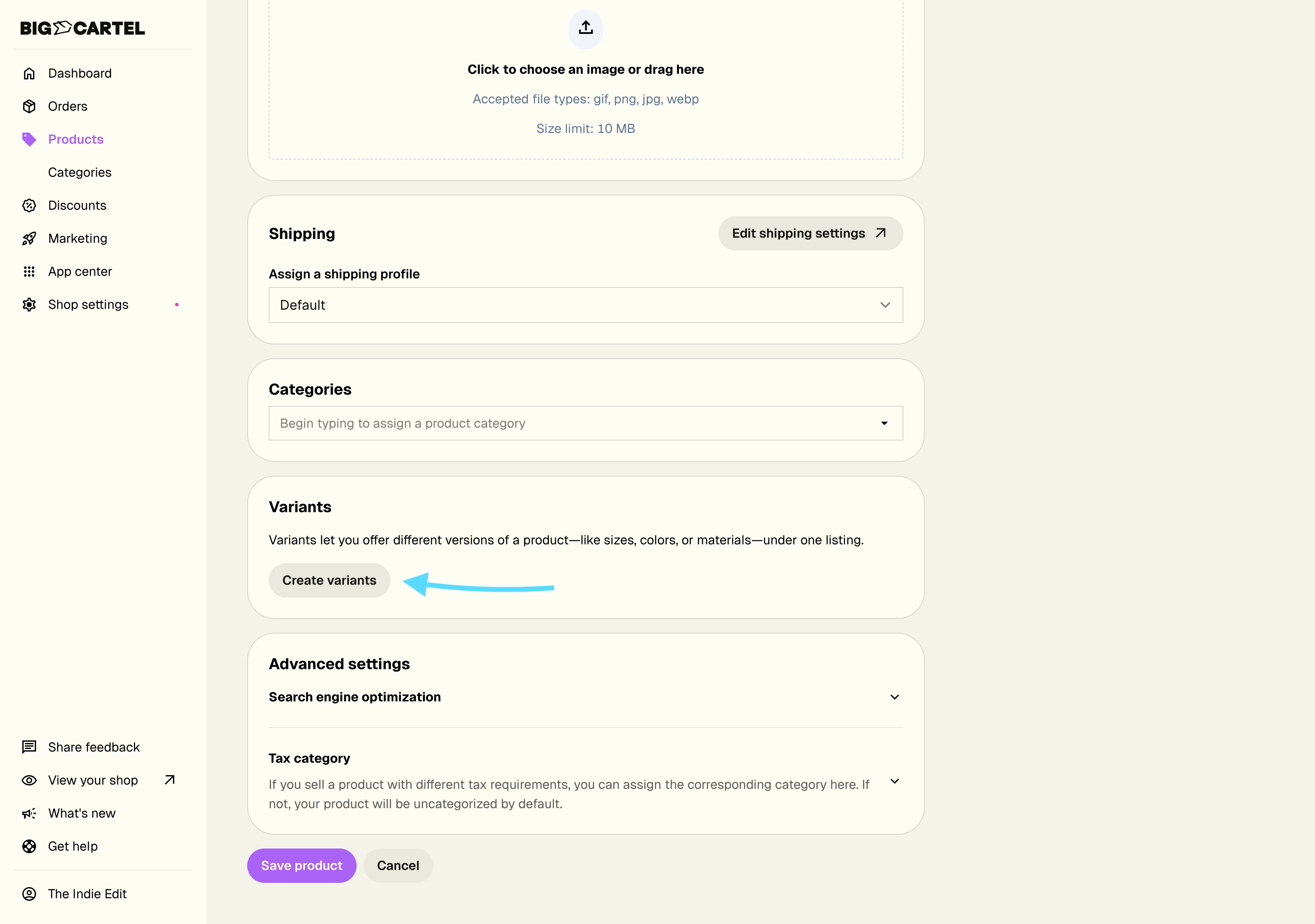 As you’re adding or editing products in the Products section, you’ll see a button that says Create variants. Select that button, and you’ll see a space to name your Variant Group.