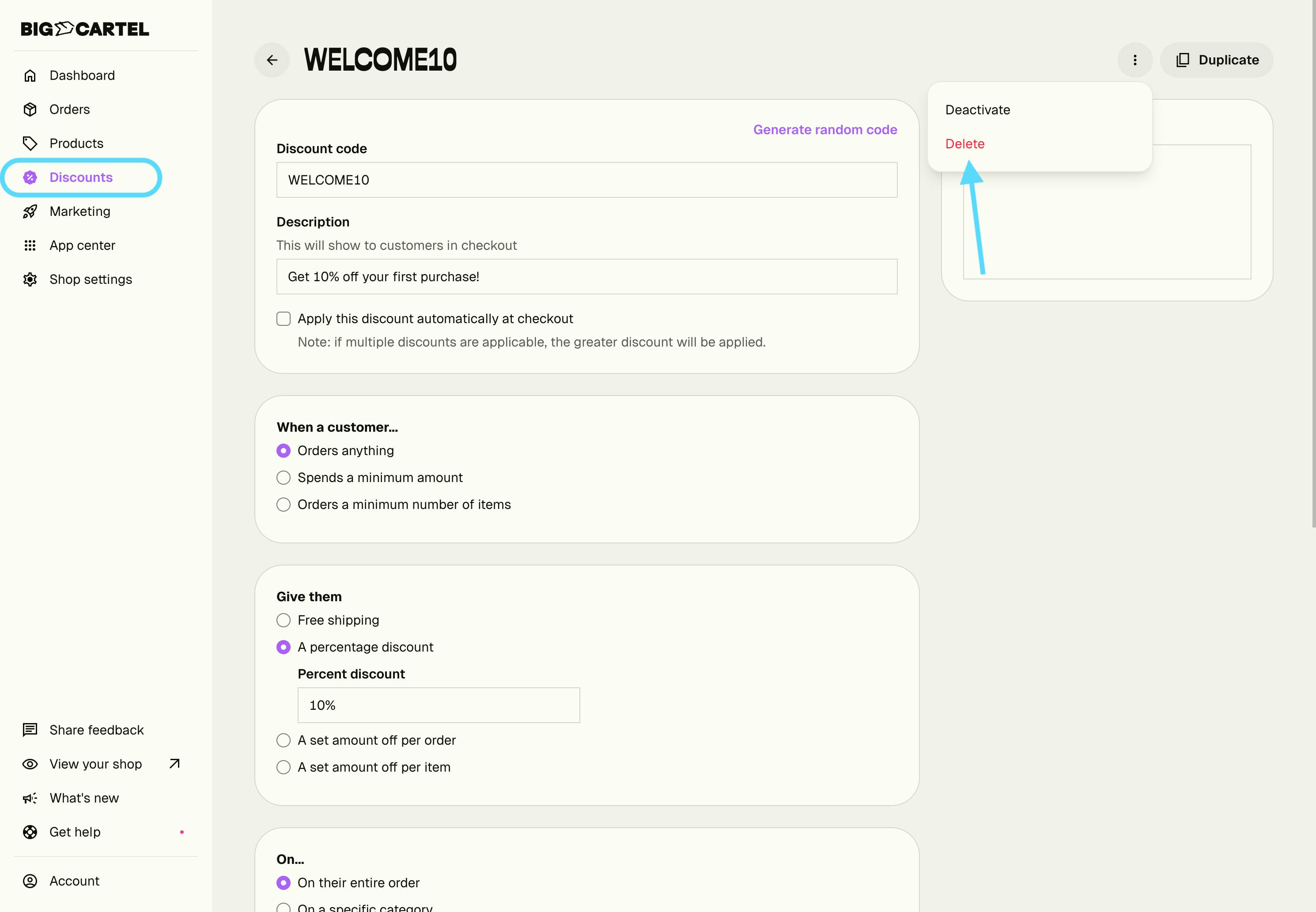 - To delete it permanently, click the action menu then Delete discount.