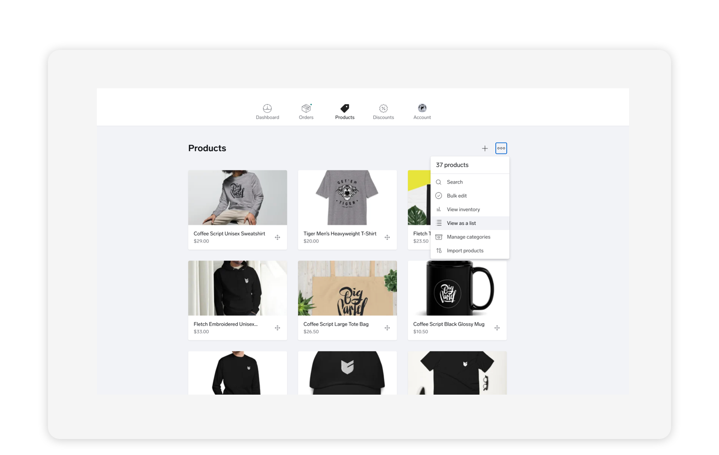 - Navigate to the Products section in your Big Cartel admin. Select the
