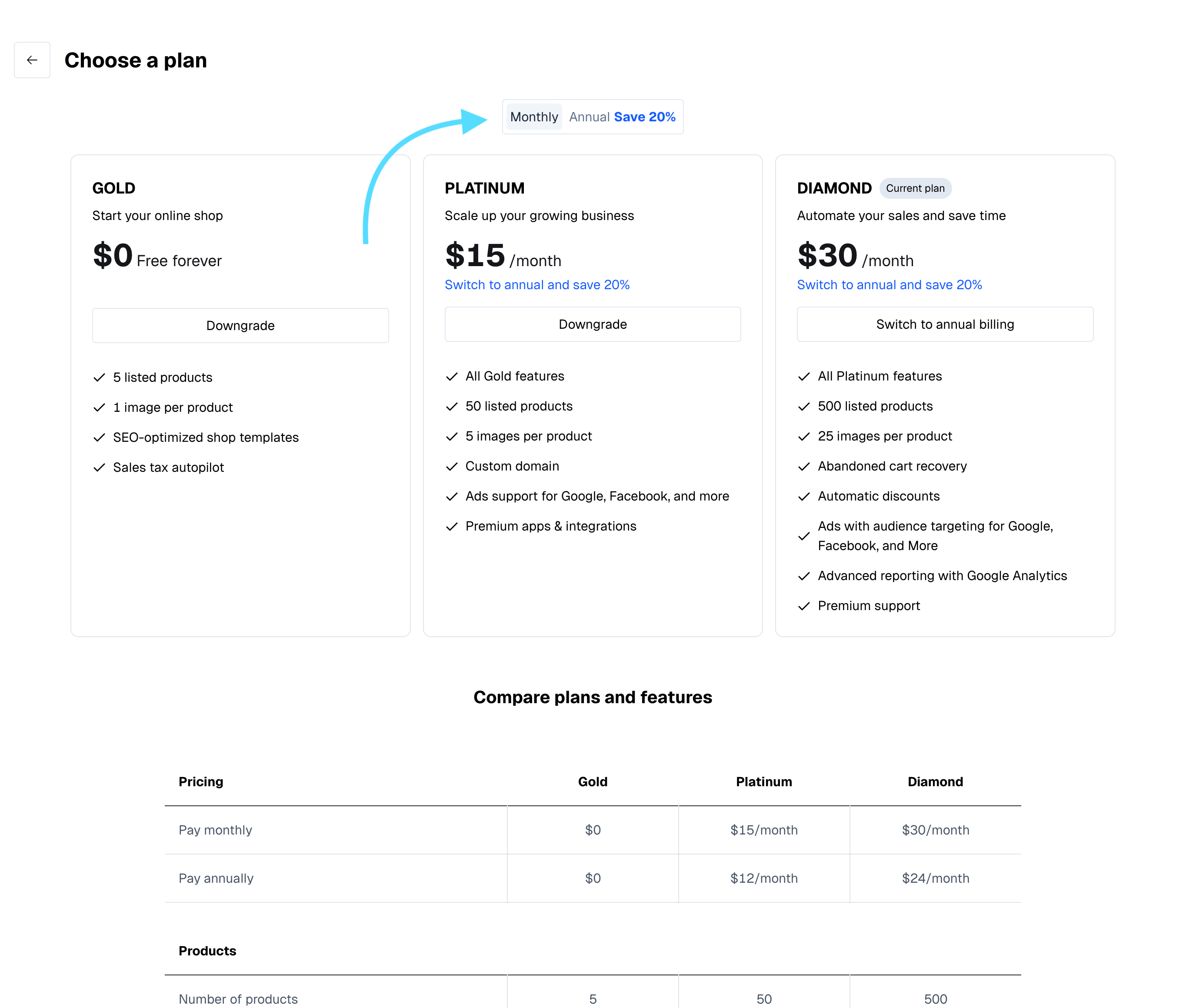 Heads up! If you downgrade from a paid plan to a free Gold plan, your shop will be placed in maintenance mode if your product count exceeds five products. To bring your shop back online, you'll need to choose the five products you want to keep in your shop.