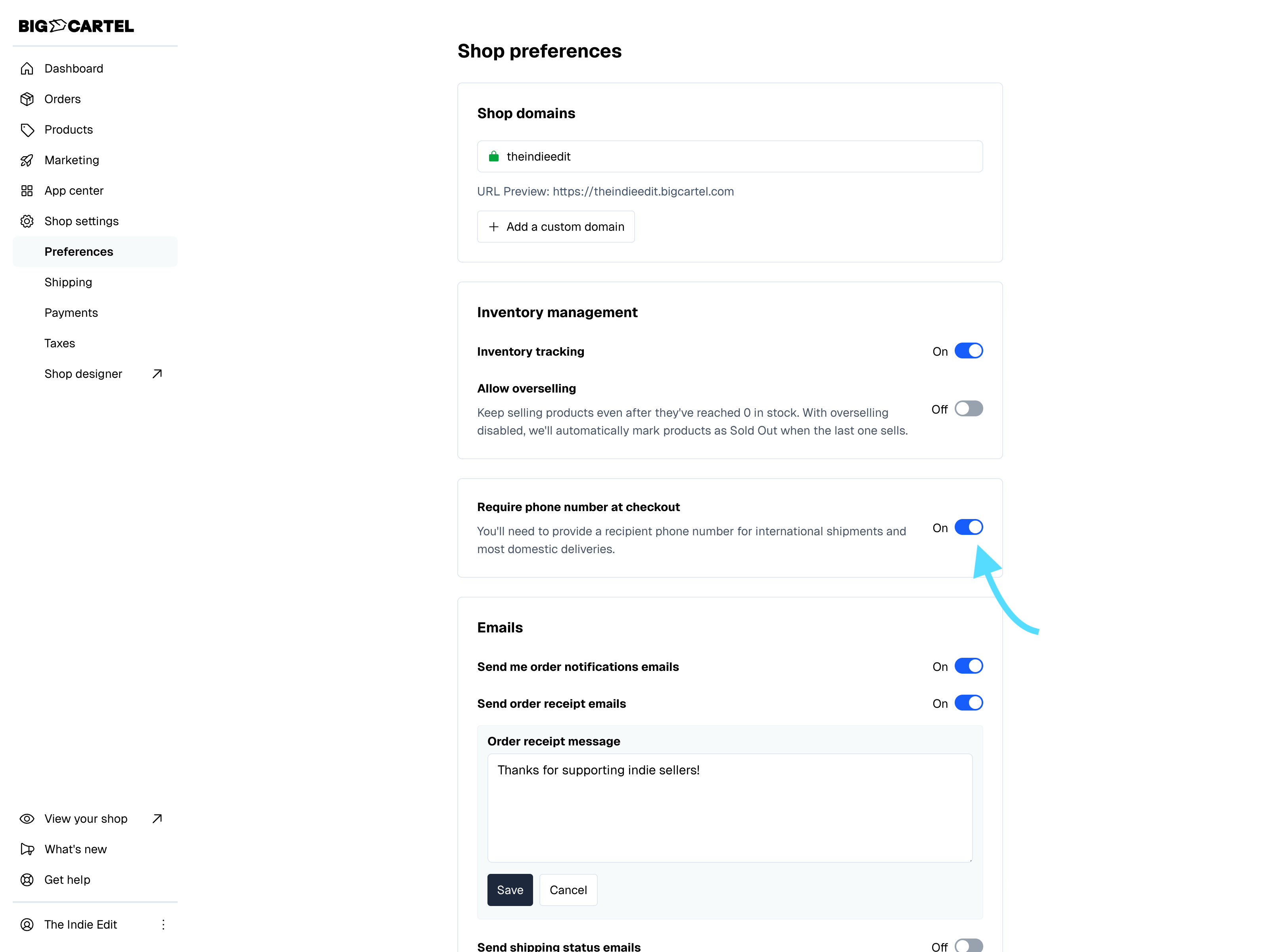 Heads up! By default your customers have to enter their phone number at checkout in your shop. Don't want an extra step between your customers and their orders? Just toggle it off in your Shop settings under Preferences.