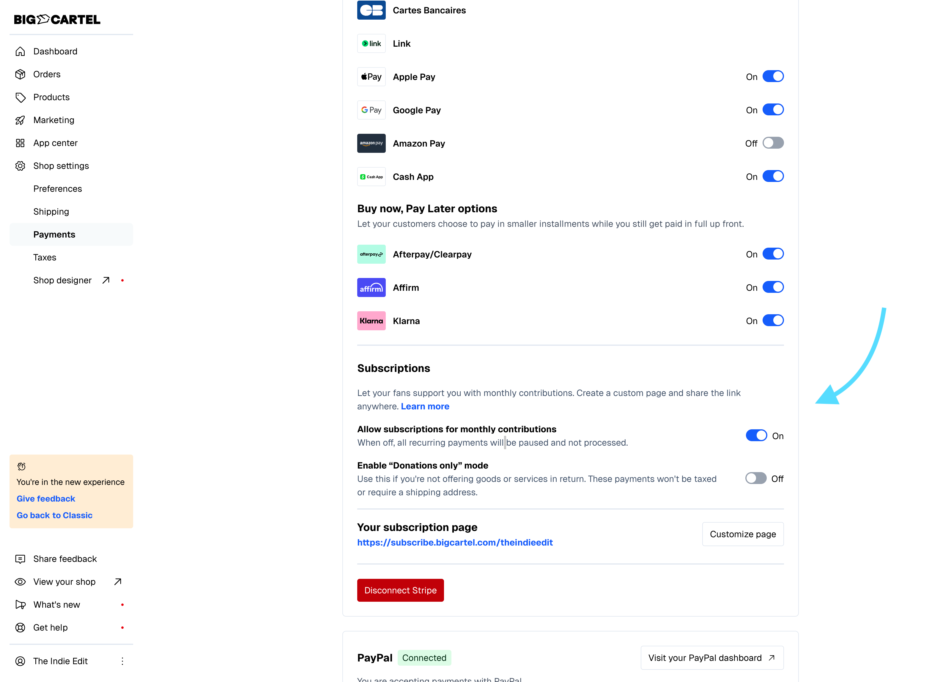 - Go to Shop settings > Payments,