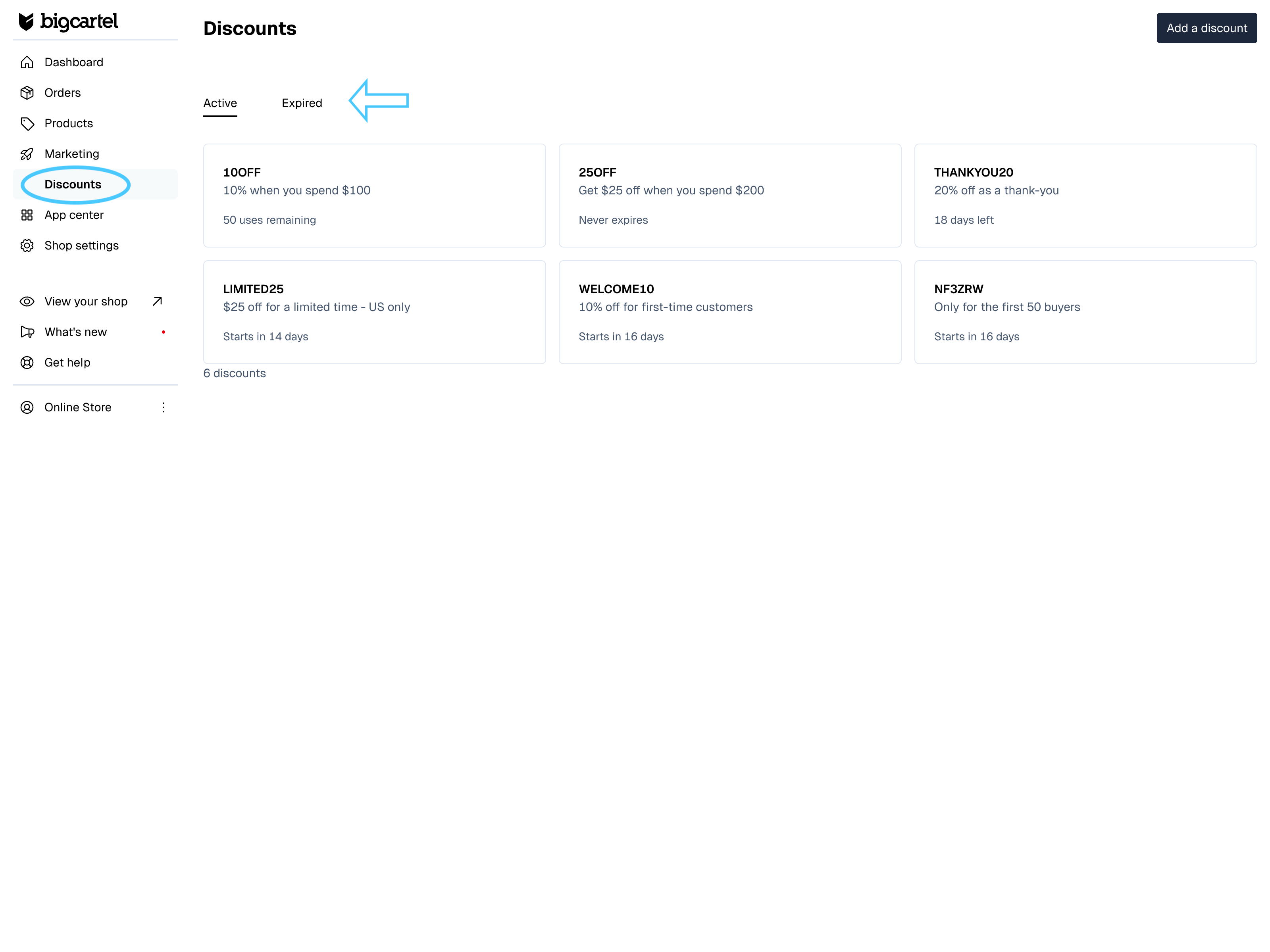 Once a discount expires, it will automatically move to the Expired section to help keep things organized. You can easily toggle between your Active and Expired discounts at any time.